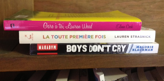 L'idée a emballé ma collègue de bureau qui a fouillé dans sa propre bibliothèque et a créé de véritables bijoux. En découvrant tout le potentiel d'un tel jeu, j'ai eu envie à mon tour de fouiller dans la bibliothèque mobile qui me suit dans les cours que je donne et qui regorge de titres pour adolescents. J'ai vraiment eu un plaisir fou à regrouper des titres et à transformer leur message au contact des autres. Au fil de mes inventions, je me suis rendue compte que j'ai tendance à regrouper les titres par trois, formant plus des haïkus que des textes.
