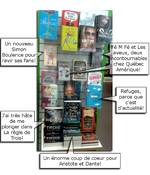 Selon Patrick Isabelle, libraire à la Librairie Verdun, c'est encore assez tranquille même si ça commence à arriver. Voici le présentoir ado de la librairie, tel qu'il était samedi le 5 septembre, et les suggestions de lecture de Patrick!